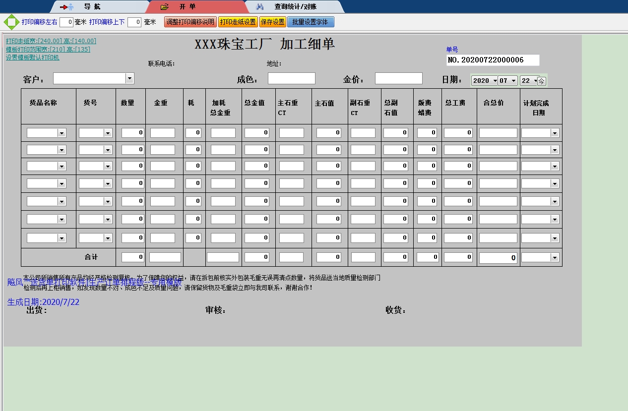 XXX珠宝工厂加工细单打印模版 }