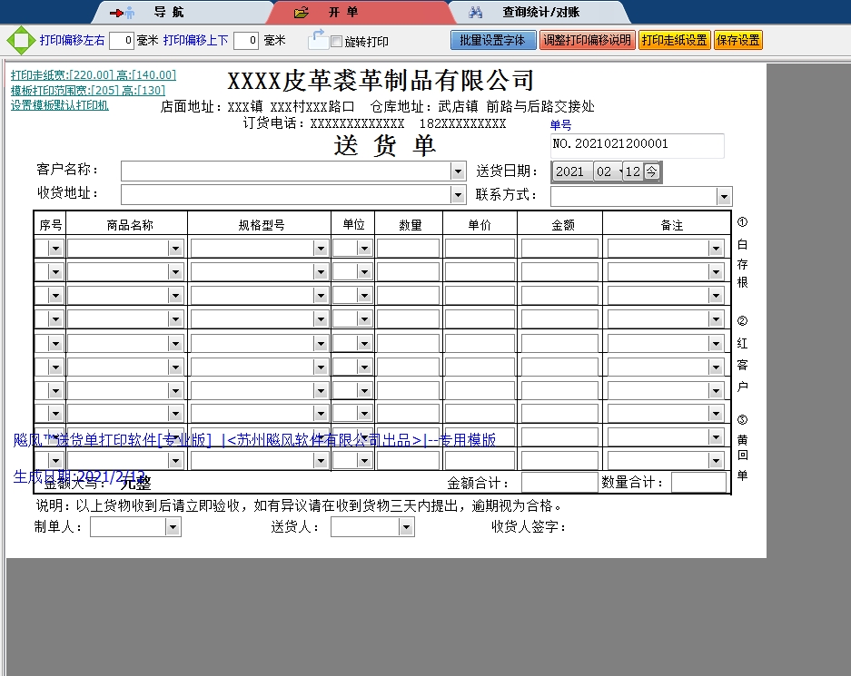 采用开放式结构设计,可根据送货单打印格式、单价及总价合计方式创建模板。