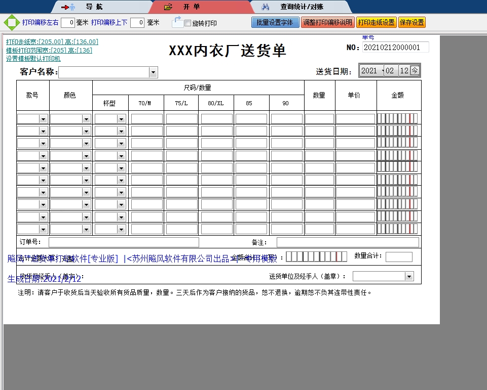 此页面为: XXX内衣厂送货单打印模板展示页面,打印模板可定制
