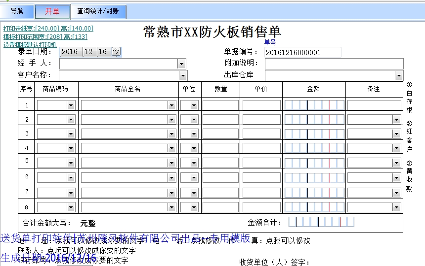 客户名称: 经 手 人: 录单日期: 商品编码 序号 数量 单价 金额 合计金额大写: 金额合计: 根 ② 户 ① 红 客 白 ③ 黄 备注 存 收 常熟市XX防火板销售单 单位 1 2 3 4 5 出库仓库: 地 址:点我可以修改成你要的文字 电 话:点我修改 传 真:点我可以修改 联系人:点玩可以修改成你要的文字 单据编号: 商品全名 6 7 款 8 附加说明: 银行账号:点我修改成你要的文字 收货单位(人)签字: 制 单 人: 出库经手人: